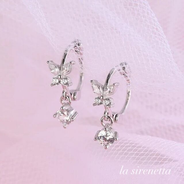 揺れるジルコニアがついた、バタフライのフープピアスです。