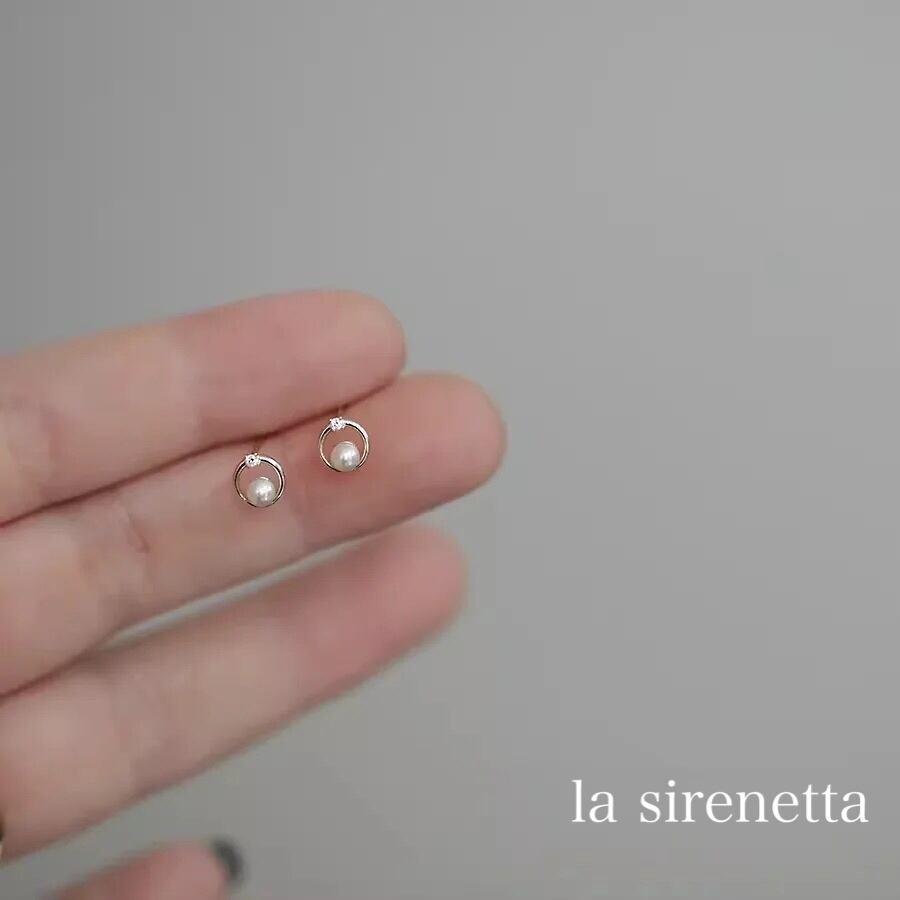 イミテーションパールとジルコニアがついた円デザインのピアスです。