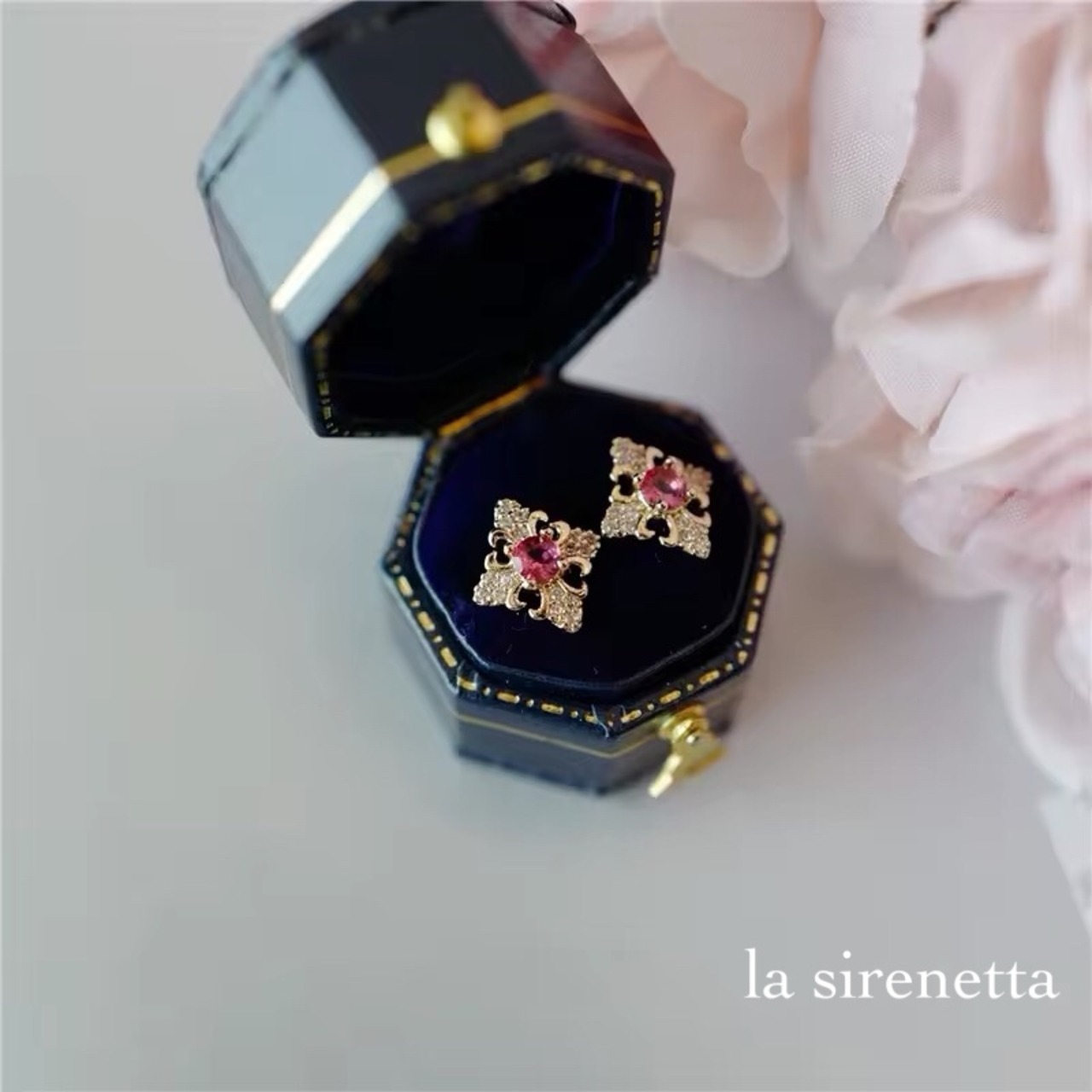 ピンクのジルコニアを使用したひし形スタッドピアス。